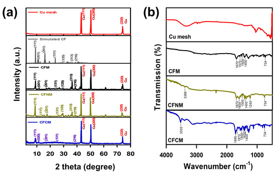 (a) XRD patterns, and (b) IR spectra of pristine Cu mesh, CFM, CFNM and CFCM.