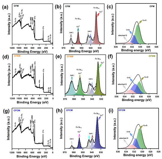 Full survey and core-level XPS analyses of (a–c) CFM, (d–f) CFNM and (g–i) CFCM.