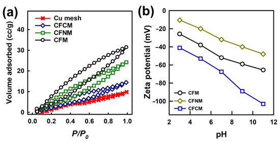 Since the reduction of nitrogen-containing contaminants is an aqueous reaction, and CuCF was functionalized with different functional groups, it would be useful to further explore the surface charges of these CuCF meshes [40]. Figure 6b displays the zeta potentials of CuCF meshes, which all exhibited relatively negative charges in the range of pH = 3~11. In particular, CFM exhibited −25.8 mV at pH = 3, then continuously decreased at increasing pH values, and eventually reached −65.9 mV at pH = 11. On the other hand, CFNM showed −10.5 mV at pH of 3, then also progressively dropped at higher pH values, and then reached −48.0 mV at pH = 11. Moreover, CFCM revealed a surface charge of −41.1 mV at pH = 3, which then continuously decreased, and dropped to −103.0 mV at pH = 11. These results suggest that the functional group of CuCF meshes certainly influenced their surface charges; the amine group might enable CuCF mesh to exhibit less negative charges, whereas the existence of carboxylate groups would enable CFCM to exhibit much more negative surface charges. These surficial properties might then affect their behaviors during catalytic reactions of contaminant reduction. On the other hand, these CuCF meshes were also further analyzed using thermogravimetric (TG) analysis; the corresponding TG curves are displayed in Figure S5. Since the mesh itself was Cu, which would be oxidized in air to become Cu oxides, TG analyses of these CuCF meshes were conducted in N2. Overall, these CuCF meshes remained relatively stable up to 150 °C, with very slight weight losses possibly due to moisture. Subsequently, these CuCF meshes started to decompose, and underwent a series of weight losses in the range of 300~400 °C because of thermal decomposition of ligands. These TG results demonstrated that these CuCF meshes would be very stable at ambient conditions, especially in the range for aqueous reduction reactions.