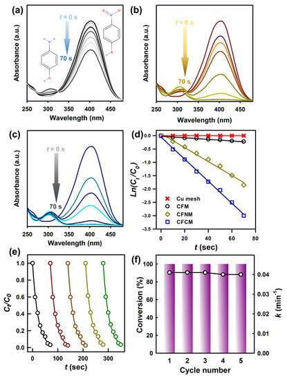 After NaBH4 was introduced, the absorption peak of 4-NP at 317 nm would be shifted to 400 nm as a result of deprotonation of 4-NP [3,41,42,43], as shown in Figure 5a. Figure S7 shows UV-Vis spectral variation of 4-NP in the presence of pristine Cu mesh and NaBH4, and the peak of 4-NP at 400 nm was almost unchanged over 150 s, demonstrating that the pristine Cu mesh cannot incorporate with NaBH4 for reducing 4-NP. Figure 7a also shows UV-Vis spectral variation of 4-NP in the presence of CFM, and the peak of 4-NP at 400 nm certainly changed and became noticeably smaller. On the other hand, a short peak at 300 nm was observed, indicating that 4-NP had been converted to 4-AP. Nevertheless, the reduction of 4-NP by CFM could not be completely achieved in 70 s. On the other hand, when CFNM was then employed (Figure 7b), the maximum peak of 4-NP at 400 nm decreased quickly, and almost disappeared in 70 s, whereas the peak of 4-AP raised up noticeably, indicating that transforming 4-NP to 4-AP was achieved in a very short period. On the other hand, when CFCM was used, the peak of 4-NP decreased even faster (Figure 7c), and completely disappeared in 70 s, with the noticeable peak of 4-AP raised up.