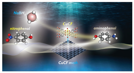 Nitrogen-containing phenolic contaminants (NCPCs) are almost ubiquitous in industrial wastewaters [1]. Amidst numerous NCPCs, nitrophenols (NPs) have been increasingly concerning, since NPs can interfere with the nerve/blood systems of the human body [2]. Thus, several methods (e.g., physical, chemical, and biological techniques [3,4]) have been developed for removing NPs, especially 4-NP, from wastewaters to prevent its harmful impact. Among these various techniques, chemically reductive treatment of 4-NP represents an advantageous technique, as the toxic nitro group of 4-NP can then be catalytically transformed to a less-toxic amine moiety, affording 4-aminophenol (4-AP); this is especially advantageous because 4-AP is a valuable molecule that can be used for the synthesis of chemical products [5,6,7,8,9,10].