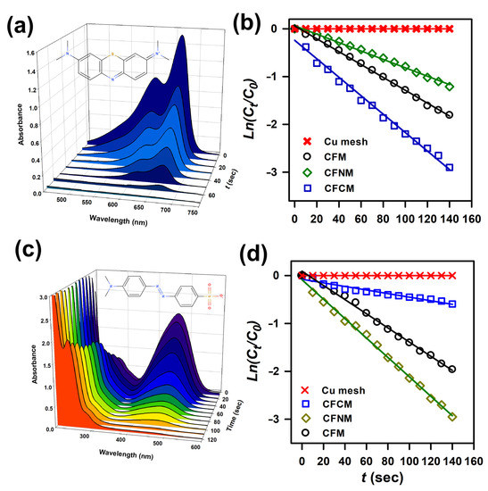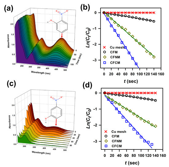On the other hand, Figure 9c displays the reduction of another isomer, 3-NP, in the presence of NaBH4 and CFCM at different reaction times, in which the characteristic peak of 3-NP located at 417 nm rapidly decreased, and almost vanished after 90 s. This also validated that CFCM can be applied for 3-NP reduction. Furthermore, Figure 9d shows 3-NP in the presence of pristine Cu mesh and NaBH4; nevertheless, the concentration of 3-NP was almost the same, signifying that the pristine Cu mesh itself could not reduce 3-NP. Once CFM was then adopted, 3-NP was slightly decreased; however, the reduction efficiency was also relatively low, and its k was merely 0.18 min−1. When CFNM was employed, 3-NP was noticeably reduced, and its kinetics were notably expedited with a higher k = 0.84 min−1. Moreover, CFCM could also lead to a much higher rate constant of 3-NP reduction as k = 1.5 min−1.