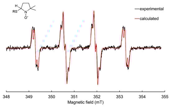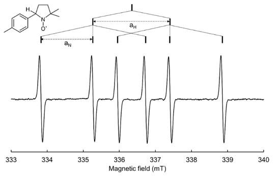 The trapped radical can be identified by comparing the HFS values deduced from the analysis of the spectrum to those from the literature, considering they may slightly vary depending on the nature of the solvent. Useful compilations of HFS are found in the work by Buettner [] and in the online NIEHS database https://tools.niehs.nih.gov/stdb/index.cfm (accessed on 12 May 2022).