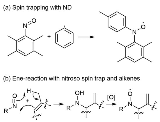 Yet, the use of nitroso spin traps is limited due to several disadvantages. Nitroso compounds are generally in equilibrium with their dimers in solution, which do not perform spin trapping reactions. Formation of nitroxides following the unwanted ene-reaction between the spin trap and carbon–carbon double bonds may also seriously interfere with the detection when alkenes [] are present (Figure 4). Silyl radical adducts of nitroso compounds [] are also unstable at room temperature and are scarcely detected. Finally, the high toxicity of nitroso spin traps limits their use in photochemical applications.