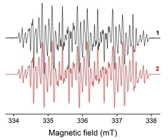 Once EPR spectra have been recorded, attribution of the signal to specific radical species involves extraction of hyperfine coupling constants. A lot of information can be obtained from careful examination of the spectra []. When approximate values of the parameters have been determined, more precise values are derived from fitting of a calculated spectrum to the experimental data with the help of numerical simulation software. In spin trapping experiments, the most popular programs are WinSim [], made freely available to the EPR community by NIEHS at https://www.niehs.nih.gov/research/resources/software/tox-pharm/tools/index.cfm (accessed on 12 May 2022), and EasySpin, a dedicated MATLAB toolbox []. A correctly performed simulation requires optimization of the following variables for each radical species: aN and the HFS for additional coupling nuclei, the relative weight of each species in the spectrum, the g-value, the linewidth, and the Lorentzian component of the lineshape. The number of variables rises thus very quickly when mixtures of adducts are detected, making the simulation a very challenging task. One must be careful not to overinterpret the results of numerical simulation.