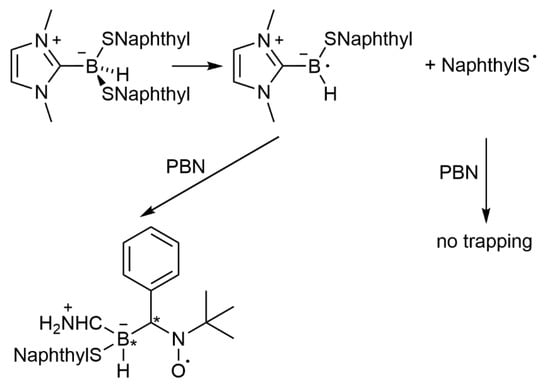 Formation of the diastereomeric nitroxide spin adduct (bearing two stereogenic centres) may result from the radical trapping reaction. This can translate into different EPR spectra, because of differences in the interactions between substituents [], and further add to the complexity of interpretation. The difference between the spectra of diastereomers may be so small that only one set of HFS is observed, as in the PBN spin adducts derived from NHC-boryl bis-sulfide photopolymerization initiators [] (Figure 8).