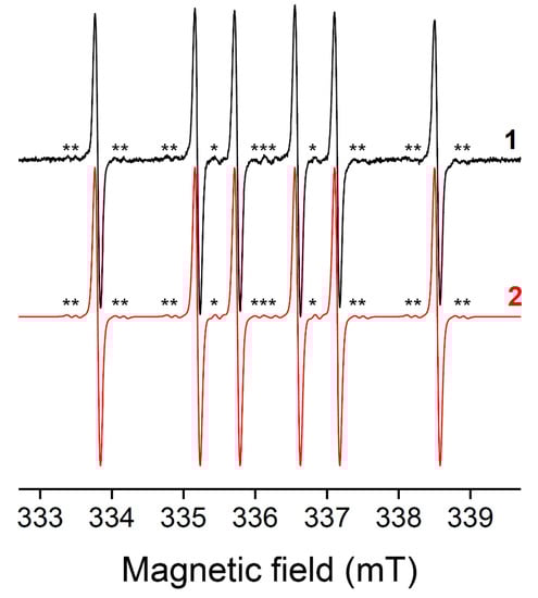 Experimental (1) and simulated (2) EPR spectra of the (4-methyl)phenyl radical spin adduct of DMPO obtained upon LED irradiation at 400 nm of allylated purpurin and Iod in benzene under argon. Satellite lines due to hyperfine coupling to 13C are indicated with asterisks. Reproduced from Ref. []. Copyright 2021 permission Royal Society of Chemistry.