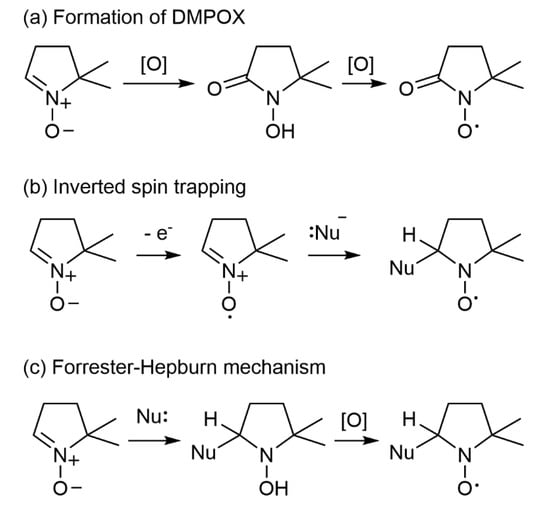Pathways leading to artefactual detection of nitroxides in spin trapping experiments: (a) formation of the DMPOX nitroxide characterized by a 7-line EPR spectrum under oxidizing conditions; (b) inverted spin trapping; and (c) Forrester-Hepburn mechanism. DMPO is used as a model spin trap in this figure, but similar mechanisms exist for other nitrones. [O] stands for the oxidation step, and Nu: for nucleophiles such as thiols.