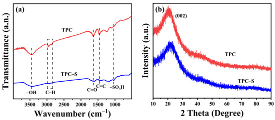 Figure 1b shows the XRD diffraction patterns of TPC and TPC–S. A wide diffraction peak (002) at 10–30° was observed for TPC and TPC–S due to the amorphous structure of polymeric carbon derived from aromatic carbon. TPC–S prepared by sulfonation of TPC had no change except a decrease in peak intensity. This is because the concentrated H2SO4 affects the structure of the chemical bonding of the biocarbon [25]. Generally, carbon with an amorphous structure is due to its disordered layered structure [26], indicating that the polymeric carbon is stacked by aromatic carbon layers. The carbon layer spacing of the catalyst was calculated by the Bragg formula, as shown in Table 1. The carbon layer spacing of TPC–S was 0.413 nm, slightly smaller than that of TPC (0.443 nm) because the introduction of –SO3H reduced the distance between carbon layers. This further proved the successful introduction of –SO3H into TPC.