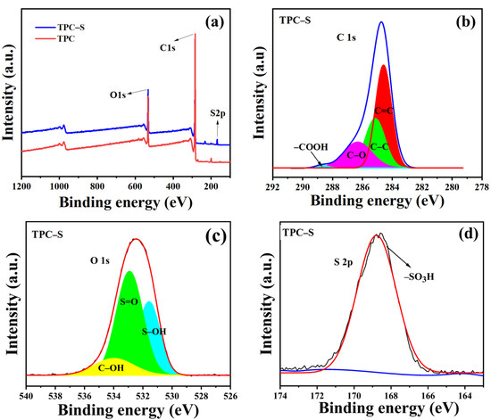 The XPS spectra of the unsulfonated sample (TPC) and sulfonated sample (TPC–S) were detected to identify the elemental composition (Figure 2). Figure 2a provides the C 1s, O 1s, and S 2p XPS signal bands of TPC and TPC–S, which showed peaks at 284 eV, 533 eV, and 169 eV, respectively. The S 2p signal band was not found in TPC. The C 1s fitting spectra of TPC–S (Figure 2b) showed four single peaks at 288.8 eV, 286.5 eV, 285.1 eV, and 284.4 eV, corresponding to –COOH, C–O, C–C, and aromatic carbon, respectively [27]. The O 1s peak of TPC-S could be deconvoluted into three components at 534.0 eV, 532.8 eV, and 531.5 eV, which were due to the C–OH of phenol and the S=O and S–OH of –SO3H, respectively [28]. The S 2p XPS fitting spectra (Figure 2d) of TPC–S indicated the presence of S6+ (168.5 eV) in it [29]. These results indicated that –SO3H was successfully grafted onto TPC after sulfonation with H2SO4.