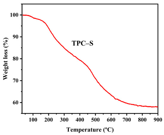 The thermal stability of TPC–S was investigated by thermogravimetric (TG) analysis at 25–900 °C, as shown in Figure 6. According to the TG curve figure, the weight loss of TPC-S could be divided into three stages with increases in temperature. At 25–200 °C, there was a 6.1% weight loss for TPC–S, which could be attributed to the removal of a small amount of water adsorbed on TPC–S [34]. The second weight loss was 17.5% at 200–450 °C, due to the decomposition of –SO3H groups into SO2 [35]. The final weight loss was 17% at 450–700 °C, which was the further decomposition of surface functional groups such as –OH and –COOH [36]. In addition, it is worth noting that TG analyses were carried out under a nitrogen atmosphere, with too much weight loss during the second and third stages. This is because the catalyst in this study was prepared by polymerization of aromatic monomers, during which oligomers (e.g., dimer and trimer) were formed. These oligomers were decomposed at 200–700 °C [37]. The catalyst was basically carbonized at a calcination temperature of >700 °C, resulting in a significant decrease in the pyrolysis rate. The TG curve of TPC–S showed that –SO3H of the catalyst could be retained below 200 °C, which ensured that the reaction temperature would be within this range.
