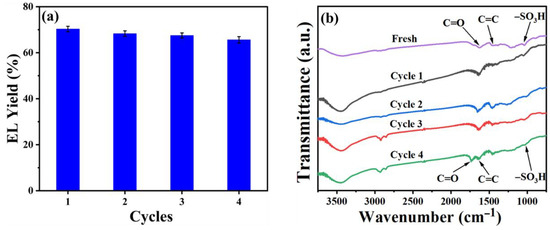 According to the previous descriptions, the reaction was repeated for 10 h at 130 °C to study the reusability of TPC–S for EL preparation. As shown in Figure 9a, after four runs of TPC–S, the yield of EL decreased slightly from 70.3% to 65.6%, indicating that TPC-S had high stability. Most of its catalytic active sites were not leached after repeated use. This result can be confirmed by the FT-IR spectra (Figure 9b) before and after the use of the catalyst. Compared with the fresh catalyst, the C=O and C=C bond peaks of the catalyst gradually shifted after the first three uses. This is because a few of the products or byproducts adhered to the pore of the catalyst, altering the molecular interaction within the catalyst, thereby changing the chemical shift [31]. However, more shifts occurred after the fourth cycle due to more humin or other impurities adhering to the catalyst. Moreover, it was observed that the peak intensity corresponding to –SO3H gradually decreased, which was owing to the leaching of a small amount of –SO3H during the catalyst washing process. This was the cause of a slight decrease in EL yield.
