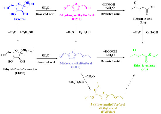 Lignocellulose, as one of the renewable sources of energy, is estimated to increase by approximately 120 billion tons annually worldwide [1]. However, such a large amount of lignocellulose faces the usual problem of not being used with high value. Most of it is disposed of by direct combustion or landfill, which not only produces large amounts of CO2 to pollute the environment but also occupies living space [2]. Lignocellulosic biomass is calculated to be equivalent to 50 billion tons of fossil energy if fully utilized [3]. Therefore, improving its utilization efficiency is of great significance to economic growth, environmental friendliness, and social progress [4]. For example, lignocelluloses can be converted into fuels and fine chemicals by thermochemical conversion. The products obtained by its transformation involve various C5 (e.g., xylose, arabinose) and C6 (e.g., glucose, fructose, galactose, and mannose) sugars, and their derivatives such as furfural (FF), 5-hydroxymethylfurfural (HMF), levulinic acid (LA), 5-ethoxymethylfurfural (EMF), and ethyl levulinate (EL) [5,6,7,8]. EL, as a short-chain platform molecule, is widely used in various fields. Because of its unique flavor and appropriate viscosity, it is often used as a food flavoring agent and plasticizer [9]. In addition, it has a high energy density (24.8 MJ/L), which can reduce the emission of toxic gases (SOX, NOX) when mixed with traditional diesel (<5 wt%) [10]. At the same time, it can improve the low-temperature fluidity of mixed diesel and give it better combustion efficiency [11]. EL is also used as the substrate for the synthesis of downstream products, such as γ-valerolactone obtained by the transfer hydrogenation of EL [12].