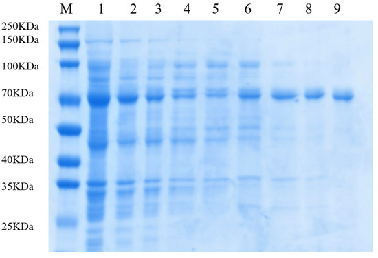 After PsDex1711 was successfully expressed under the optimal expression conditions, Ni NTA was used for affinity chromatography purification; the results are presented in Figure 2. After elution with different concentrations of imidazole solution, the miscellaneous protein gradually decreased. It was detected through 10% SDS-PAGE gel electrophoresis. The results showed that 300 mM imidazole had the best elution effect on the miscellaneous protein, and a single band having a molecular weight of approximately 70 kDa was obtained, which was consistent with the results of bioinformatics analysis.