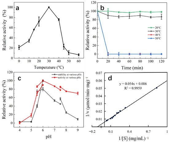 The buffer solution (pH 4.0–9.0, final concentration of 50 mM) was mixed with the substrate, and the enzyme activity was measured at the optimum temperature. The enzyme solution was mixed with buffer solutions at different pH and a final concentration of 50 mM, and the residual enzyme activity was determined at 30 °C for 1 h. All experiments were performed in triplicate.