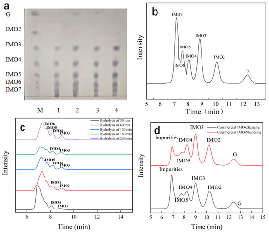 Isomaltose (IMO2), isomaltotriose (IMO3), isomaltotetraose (IMO4), isomaltopentaose (IMO5), isomaltohexaose (IMO6), and isomaltoheptaose (IMO7) were used as the standard for thin layer chromatography (TLC). All samples and commercial isomaltooligosaccharide were taken at 3 μL for TLC analysis.
