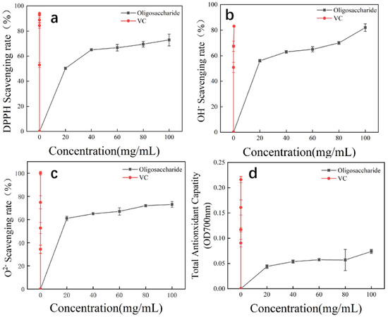 Antioxidant activity analysis of hydrolysis products of PsDex1711. The red line is the amount of VC added. (a) DPPH scavenging rate; (b) Hydroxyl radical scavenging activity; (c) Superoxide anion clearance rate; (d) Antioxidant capacity.
