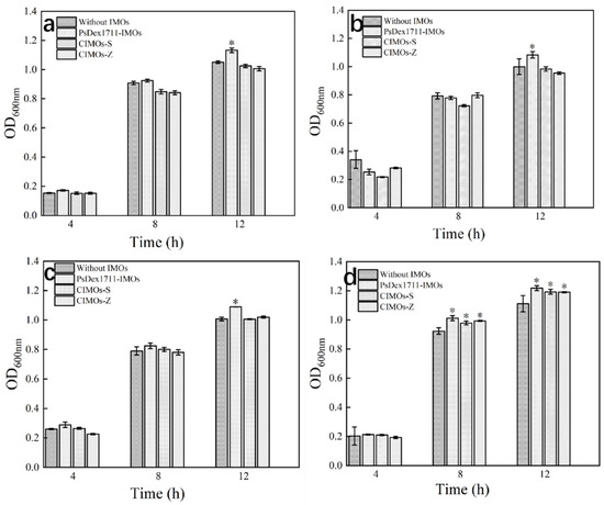 Effects of different isomaltose supplemental levels on the growth of the four probiotics: IMO supplemental levels were 0.5, 1, and 2.5 g/L, respectively; (a) Lactobacillus paracei, IMO was 1 g/L; (b) Bifidobacterium infantis, IMO was 2.5 g/L; (c) Lactobacillus reuteri, IMO was 1 g/L; (d) Bifidobacterium lactis, IMO was 1 g/L. *: The results were significantly different compared to the control group.