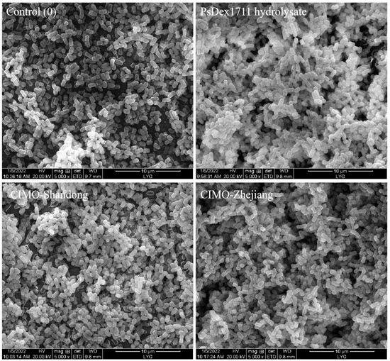 The promoting effect of IMOs on the formation of lactic acid bacteria biofilm was observed through scanning electron microscopy. (5000×, from the left to right with no addition, add the PsDex1711 hydrolysate, add CIMO-S, and add CIMO-Z).