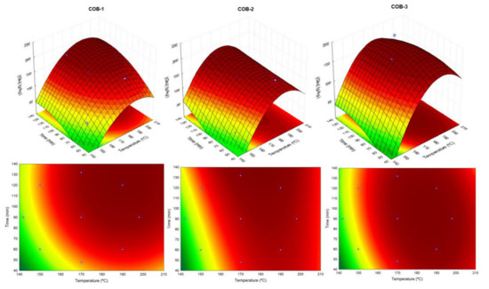 Three-dimensional response surface plots, and respective contour plots, of soluble sugar production (g glucose equivalent per kg of extracted olive pomace), from Cobrançosa pomaces, as a function of autohydrolysis conditions (temperature and time). COB-1, COB-2 and COB-3 correspond to Cobrançosa pomaces obtained from olives at different ripening stages (see Table 2).