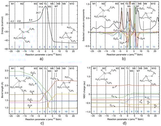We utilized URVA to monitor and analyze the OO bond breakage and the formation of the new CO bonds during the epoxidation reaction. A comprehensive review of URVA is presented in Ref. [] and the theoretical background of URVA is further described in Refs. [,,]; therefore, in the following, only some essential features are summarized. URVA analyses a chemical reaction along a representative reaction path, which is traced out by the reaction complex (RC), i.e., the union of reacting molecules on the potential energy surface (PES) during its way from the entrance channel via the transition state (TS) to the exit channel of the reaction.