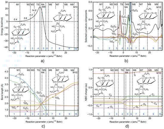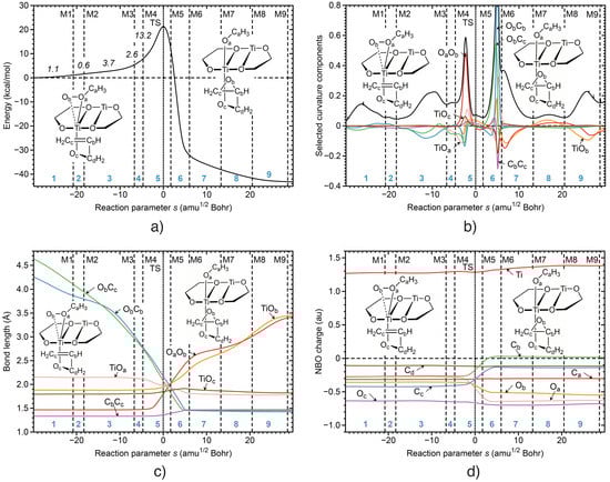 Figure 3. Properties of reaction R0 along the reaction path. (a) Energy profile, where the energy contributions of each reaction phase to the activation energy are indicated by italic numbers. (b) Decomposition of the reaction curvature into selected geometry components. (c) Change of selected bond lengths. (d) Change of selected NBO atomic charges. The curvature minima are shown as broken vertical lines and are labeled as M1, M2 and so on. The position of TS is indicated as a dotted line. The reaction phases are indicated by blue numbers. B3LYP/6-31G(d,p)/SDD(Ti) level of theory.
