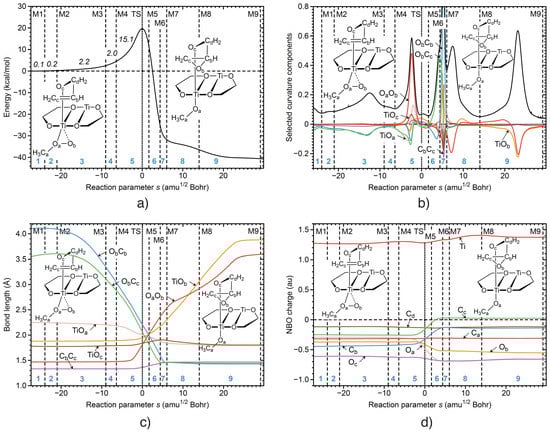 - Reaction R1: The dimeric titanium(IV)-catalyzed epoxidation reaction R1 starts in the entrance channel from a van der Waals complex, where both the methyl–hydroperoxide and the allyl alcohol are coordinated to one of the Ti atoms leading to a hexacoordinate titanium environment, as depicted in Figure 2, with a TiO distance of 1.881 Å, a slightly longer TiO distance of 2.156 Å, and a TiO distance of 1.794 Å connecting the alcohol to the metal (see Table 4, showing that both the TiO as well as the TiO bonds are well in the range of the reference TiO single bond of TiOH with a TiO distance of 1.804 Å), whereas the TiO bond with the migrating oxygen atom is already elongated. (For comparison, the TiO bond distance of the TiO double bond of the TiO reference molecule is 1.612 Å) [,]. Selected reaction properties along the reaction path obtained from the URVA analysis of reaction R1 are presented in Figure 4. The corresponding reaction movie R1 can be found in the Supplementary Materials.