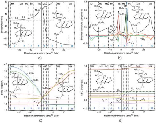 Figure 6. Properties of reaction R3 along the reaction path. (a) The energy profile, where the energy contributions of each reaction phase to the activation energy are indicated by italic numbers. (b) Decomposition of the reaction curvature into selected chemical bonds. (c) The change of the selected bond lengths. (d) The change of the selected NBO atomic charges. The curvature minima are shown as broken vertical lines and are labeled as M1, M2 and so on. The position of TS is indicated as a dotted line. The reaction phases are indicated by blue numbers. B3LYP/6-31G(d,p)/SDD(Ti) level of theory.