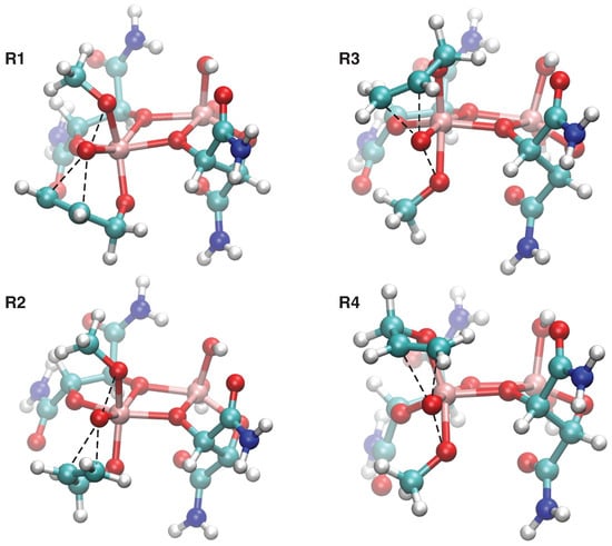 Therefore, in this work, we investigated the main reaction step of the epoxidation cycle, which involves OO bond cleavage of the peroxide group, the transfer of the O atom from the peroxide to the CC double bond of the allylic group and the formation of two CO bonds leading to the epoxide of the final product [] for the epoxidation of methyl–hydroperoxide and allyl alcohol using the dimeric Ti model catalyst shown in Figure 1b. Four different orientations of the reacting species were considered labeled as R1, R2, R3 and R4 in Figure 2. The initial catalyst geometry was taken from the X–ray structure of the complex of reaction R4 [].