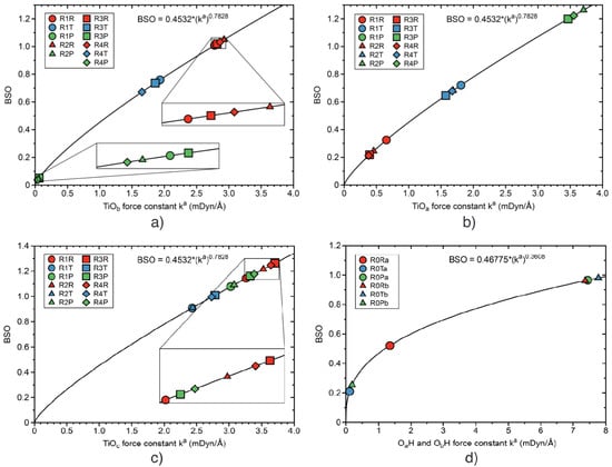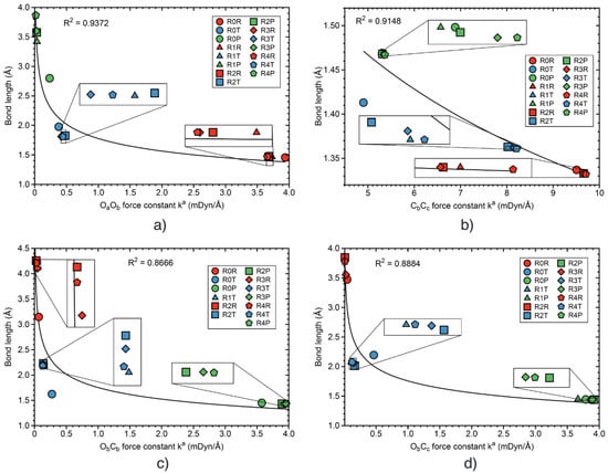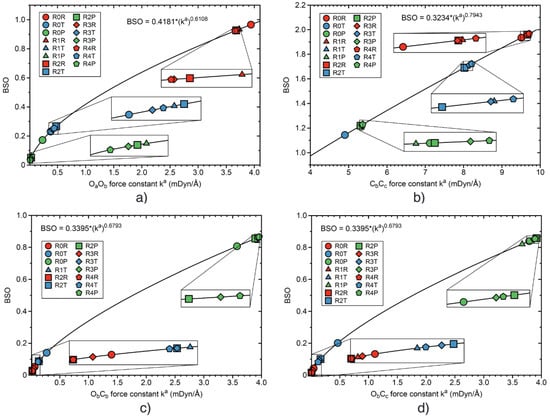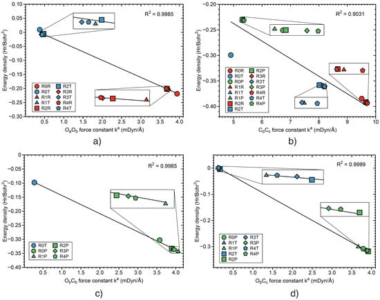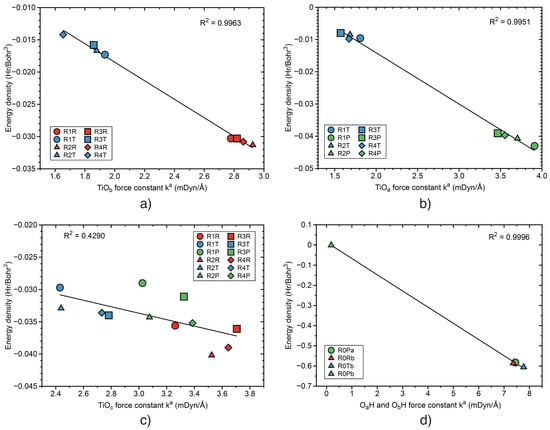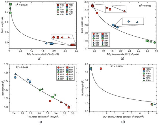 For the non-catalyzed reaction R0, instead of the TiO bonds, the corresponding OH bonds (OH and OH; see Figure 2) are analyzed. The bond properties discussed in this section include bond lengths d, intrinsic bond strengths based on local mode force constants k and associated BSOs, complemented with the energy density at the bond critical point H assessing the covalent character of the bonds. The results are summarized in Table 4, and in Figure 9, Figure 10, Figure 11 and Figure 12, general trends and correlations between these properties are illustrated.