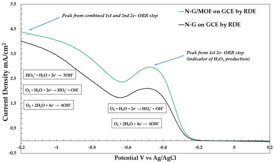 The obtained LSV curve for ORR in the 0.1 M KOH alkaline medium on the N-G/MOF catalyst is presented in Figure 1 (the green line). ORR current densities have been measured for applied potential 0.2 V to −1.2 V vs. Ag/AgCl reference electrode. The LSV curve with N-G catalyst before integrating the MOF is also shown in Figure 1 (the black line). From the comparison of these two LSV curves we can see the improvement brought by the MOF integration to the catalyst material in terms of the obtained current densities. At the −1.2 V, the obtained current density for the N-G catalyst was found around 4 mA/cm2 while the N-G/MOF catalyst produced around 4.4 mA/cm2. The comparison of the generated ORR current densities by N-G/MOF catalyst with that of other established electrocatalysts for ORR was presented in our previous studies [23,24,25,28,30]. In this study, we intend to follow the LSV curve from 0.2 V (right) to −1.2 V (left) and discuss the ORR pathways on the N-G/MOF catalyst in this applied potential range.