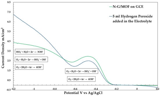 Hydrogen peroxide (H2O2) can be produced from the 2-electron transfer ORR on the catalyst surface. From our RDE experimental data for ORR on the N-G/MOF catalyst, in the alkaline medium, we can estimate that at around −0.47 V mostly the first 2-electron transfer ORR step took place. One of the products from this ORR step is HO2− species. This product is also an indicator of possible H2O2 formation because in the alkaline medium H2O2 can be decomposed through both chemically or electrochemical reactions and form the HO2− species [41,42,43].