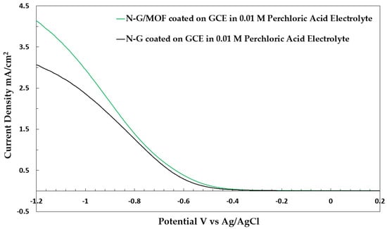 The ORR in the acidic medium follows a different reaction mechanism than that in the alkaline medium, hence, the voltammogram plots from the RDE/RRDE experiments appear different in shape. To explore the LSV curves of ORR in the acidic medium on the N-G/MOF catalyst, RDE experiments were performed in a 0.01 M perchloric acid (HClO4) electrolyte. The electrolyte was saturated with oxygen before the oxygen. Ag/AgCl reference electrode could be used in this acidic environment as well because the acid concentration was lower. The obtained acidic medium ORR current density is present as an LSV plot in Figure 3 (the green line). The LSV curve in acidic medium at the same other conditions with the N-G catalyst before integrating MOF is also presented in Figure 3 (the black line). From these two LSV curves it is clearly observed that the integration of the MOF with N-G, improved the generated current densities, substantially at the higher applied potentials, from the ORR in the acidic medium.