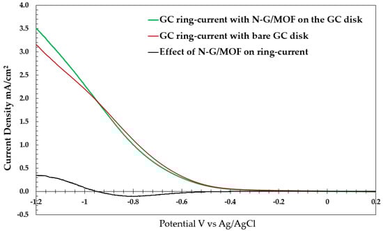 LSV curves for ring-currents from the RRDE experiments with two conditions of disk surface (green and red lines) and the effect of N-G/MOF on ring-current (black line).