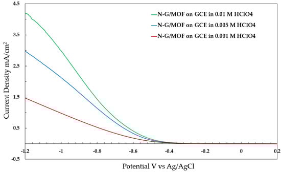 LSV plot for ORR in the 0.01 M HClO4 (green line), 0.005 M HClO4 (blue line), and 0.001 M HClO4 (red lines) electrolyte on the N-G/MOF coated GCE working electrode.