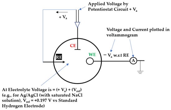 In most cases, three-electrode RDE/RRDE systems are used for electrochemical performance evaluation of the catalyst materials. The electrodes are known as the working electrode (WE), reference electrode (RE), and counter electrode (CE). Here we will briefly discuss the functions of these electrodes in the RDE/RRDE setup. With an applied potential on WE with respect to the RE, the ORR is expected to take place on this catalyst-coated disk surface of the WE. The reference electrode (RE) is itself an electrochemical half-cell and hence has its own potential when measured against the standard hydrogen electrode (SHE), Vref. This Vref varies according to the type of the RE, more specifically, they are the standard reduction potential of the electrochemical reactions that take place inside the RE cell [44]. When a voltage is applied on the RE through the potentiostat’s circuit, it maintains the constant voltage during the experiment through its internal electrochemical reactions. In reference to the constant voltage applied to RE the applied potential on the WE are counted which are plotted in the voltammograms as applied potentials (typically the x-axis). To maintain a constant voltage in RE a large amount of current should not be allowed to flow through it as this will disrupt the chemical balance inside the RE and damage it permanently. To manage this issue a counter electrode (CE) is used to supply or withdraw the required electrons to/from the electrochemical cell of the RDE/RRDE system as per the demand of electrochemical reaction in a specific applied voltage. In Figure 6, with the help of a simplified diagram, the functions of these three electrodes are presented. The same voltage, for instance, +Va, is applied to both the CE and RE by the potentiostat. Because of this applied voltage +Va the RE produces and maintains a voltage +((Va) + Vref) in the electrolyte. As the WE is kept grounded, the applied potential of WE will be measured as −((Va) + Vref) with respect to the electrolyte, and that is −Va with respect to the RE. In CV or LSV experiments, the direction (sign) and magnitude of Va are controlled by the potentiostat and kept within the potential window of the WE (discussed in the later section). Inside this potential window, only the electrochemical reactions of interest are expected to occur, therefore, the current measured from the WE at any given Va is attributed to those electrochemical reactions; for our case it is the ORR.
