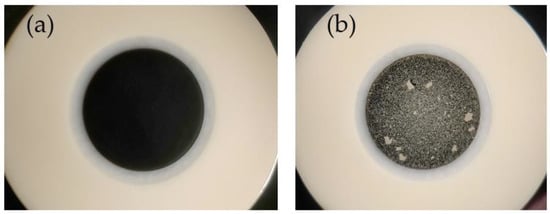 For this study, a glassy carbon (GC) disk electrode (GCt RRDE—WCO22, ALS Co., Ltd., Tokyo, Japan) was used as the working electrode in the RDE setup (RRDE–3A, ALS Co., Ltd., Tokyo, Japan) as GC has a relatively larger potential window of about 1.8 V (from about +1.1 V to −0.7 V). Nitrogen-doped graphene/metal-organic framework (N-G/MOF) catalyst was drop-casted on the GC disk electrode surface to form a thin layer of catalyst. While making this thin layer of catalyst on the WE disk surface is important to make sure that the catalyst layer fully and uniformly covers the geometric area of the disk surface (0.1963 cm2 for our disk-electrode). For this drop casting process, the catalyst was dispersed in deionized (DI) water (5 mg/16 mL of water) and sonicated for 30 min to ensure a homogeneous mixture. The 25 µL of the catalyst-ID water mixture was dropped on the mirror-polished surface of the electrode disk and dried out to form the thin layer. Calculated catalyst loading on the disk surface is 39.7 µg/cm2. If this droplet drying process is conducted at room temperature, a uniform coffee-ring-shaped catalyst layer may form on the electrode surface due to a complex microfluidic process inside the droplet [47]. Drying out the droplet at an elevated temperature improves the uniformity of the catalyst layer on the disk surface of WE. We carried out the drying process in a vacuum oven at 70–80 °C for 15–20 min. Figure 7 shows magnified and externally illuminated images of the electrode-disk surface before (a) and after (b) catalyst drop casting. The actual color of the N-G/MOF catalyst is grayish. Apparently, the drop-casted catalyst layer almost uniformly covers the GC disk surface. The white spots on the disk surface are created by the agglomeration of the catalyst particles and which did not break down during the mixture sonication process.