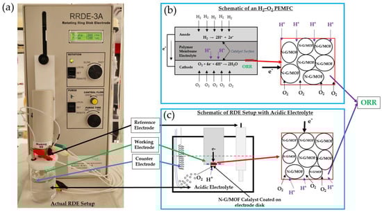 Creating the acidic medium ORR environment on the PEMFC cathode within an RDE setup: (a) actual test vial of our RDE setup; (b) schematic of working process of the H2-O2 PEMFC; and (c) schematic of the test vial of RDE setup.
