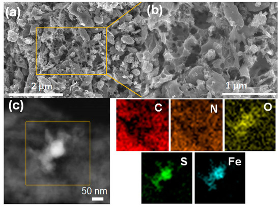 The morphology of MIL-88-850 in Figure S1a,b (in the Supplementary Materials) and FeNSC-850 (Figure 1a,b) are characterized by the scanning electron microscopy (SEM). After the carbonization of MIL-88 at 850 °C, a spindle-like structure of MIL-88-850 is observed in Figure S1a (in the Supplementary Materials). The enlarged SEM image in Figure S1b (in the Supplementary Materials) shows multiple pores on the surface of spindle-like structures after the pyrolysis process. With the addition of doping materials on MIL-88 in Figure 1a, the morphology of FeNSC-850 changed comparable with the starting templet of MIL-88. FeNSC-850 shows a hierarchical porous structure, including macro-, meso-, and micropores in the enlarged SEM image in Figure 1b. The energy-dispersive X-ray spectroscopy (EDX) pattern in Figure S2 (in the Supplementary Materials) indicates the presence of N, C, S, and Fe in FeNSC-850. As detected in Figure 1c, a high angle annular dark-field scanning TEM (HAADF-STEM) image and the element mapping of FeNSC-850 verify that C, N, and O are uniformly distributed throughout the whole structure, indicating the successful N doping within carbon matrixes. The overlap of S and C in element mapping clearly confirms the doping of S in carbon matrices. Simultaneously, the mapping results of Fe and S are superimposed, which indicates the sulfidation of Fe species encapsulated within carbon matrixes.