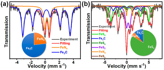Mössbauer spectra of (a) MIL-88-850 and (b) FeNSC-850, with the assignment of Mössbauer sites to iron species in the relative absorption area.