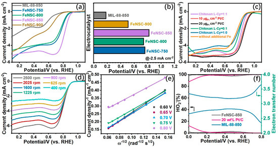 (a) Linear sweep voltammogram (LSV) curves of FeNSCs pyrolyzed with various heating-temperature from 750 to 900 °C and MIL-88 carbonized at 850 °C at 1600 rpm; (b) potentials of FeNSC-T (T = 750 − 900 °C) and MIL-88-850 at −2.5 mA cm−2 based on the LSV data from (a); (c) LSV curves of as-prepared electrocatalysts with different mass ratio of chitosan and L-Cy, the electrocatalyst without additional Fe salt with mass ratio of chitosan and L-Cy as 1:1, and commercial Pt/C at loading of 10 and 20 µgPt cm−2 with a scanning rate of 5 mV s−1; (d) LSV curves of FeNSC-850 with various rotation rates from 400 to 2500 rpm; (e) Koutecky-Levich (K-L) plots of FeNSC-850 based on the data from (d); and (f) HO2-% and electron transfer number of FeNSC-850, MIL-88-850, and 20 wt% Pt/C with Pt loading of 20 µgPt cm−2 in 0.1 M KOH electrolyte.