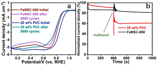 To further evaluate the durability of FeNSC-850 and 20 wt% Pt/C, cyclic voltammetry (CV) analysis was employed by scanning 5000 CV cycles from 0.5 to 1.1 V (vs. RHE) at 100 mV s−1. As shown in Figure 6a, the E1/2 of FeNSC-850 decreases by only 15 mV, which is less than that of 20 wt% Pt/C (E1/2 loss = 63 mV). In comparison with others’ work summarized in Table 2, our as-prepared NNMEs exhibit comparable or even superior ORR performances considering their catalytic ORR performances and stability. Furthermore, beneficial for practical fuel cell applications, chronoamperometric (I-t) measurements were conducted to assess the methanol tolerance of FeNSC-850 and the commercial Pt/C by the addition of 10 vol% methanol in O2-saturated 0.1 M KOH solution at around 400 s. The normalized current density in Figure 6b suggests that unlike Pt/C, FeNSC-850 displays outstanding methanol tolerance, whereas Pt/C presents a substantial decline at the point of injection of methanol in O2-saturated 0.1 M KOH media at around 400s.