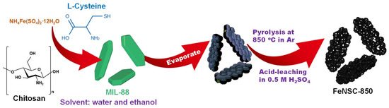 In particular, metal–organic frameworks (MOFs) have been considered as ideal substrates due to facile synthetic pathways, their large porosity, and structural versatility after pyrolysis [19,20,21]. Among them, the MIL-88 framework could be chosen as a sacrificial template for a high graphitized structure [22,23]. As reported, iron carbides possess good ORR performances in alkaline solution [24], while the Fe3C derived from the carbonization of MIL-88 shows limited ORR performances, which can be improved by the exposure of dense Fe-based active sites through modifications on MIL-88 [23]. Herein, to address this conventional drawback of MIL-88, we innovatively utilized the synergistic effect of N and S dopants by annealing MIL-88 and additional Fe salt with the assistance of chitosan and L-Cysteine (L-Cy). Especially, chitosan is a low-cost and abundant biomass-derived ligand with strong coordination with metal, and L-Cy is a N, S-containing amino acid that is commonly used to introduce S in electrocatalysts for the ORR [25]. Consequently, the simultaneous introduction of N and S doping in carbon skeletons improves the stability of Fe by the formation of FeNx, FexC, and FeSx to boost the ORR performances in alkaline solution. Combining the porosity structure; N, S-dopants; and multiple Fe-based active species, the resulting electrocatalyst of FeNSC-850 shows excellent ORR performances via a direct four-electron transfer in 0.1 M KOH solution.