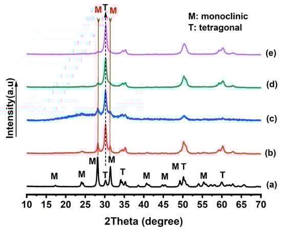 XRD patterns of 3.6 wt%V2O5/ZrO2 and P loaded catalysts at different P/V ratio (a) ZrO2, (b) 3.6 wt%V/ZrO2, (c) P/V = 0.5, (d) P/V = 1, (e) P/V = 2.
