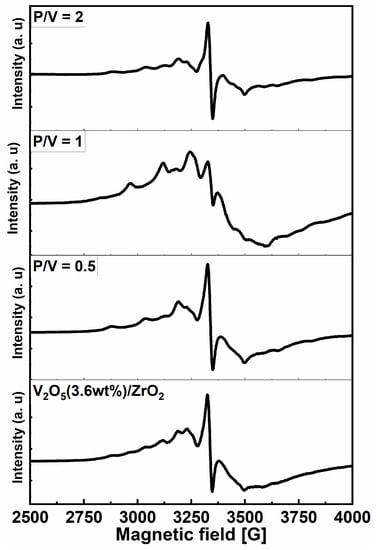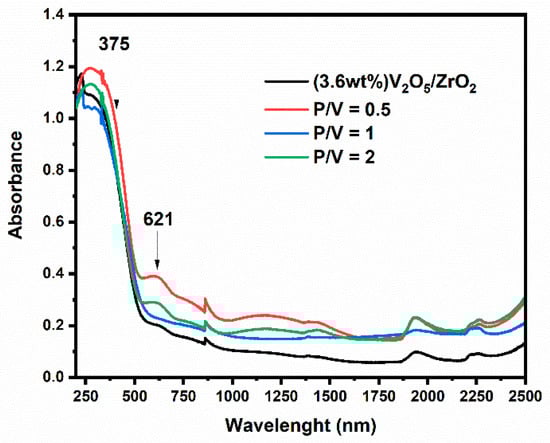 Figure 5 shows the UV-Vis-NIR diffuse reflectance spectra of the 3.6 wt%V2O5/ZrO2 and phosphate loaded samples with P/V = 0.5, 1, and 2. We noticed that the spectra present the same profile. They present a broadband, between 190 and 550 nm, assigned to the charge transfer between the full oxygen orbital and the empty V5+ orbital without forgetting the Zr4+→O2− charge transfer. After loading phosphate, a less intense absorption peak has been located around 621 nm for P/V ratios equal to 0.5 and 2; however, it disappears for the value of 1. This absorption band is due to the d-d transitions of V4+ probably of vanadyl VO2+ ions reduced from V5+, which shows that some of the V ions are in a reduced state (see ESR) [29,30]. However, the disappear of this band for P/V = 1 could be due to the absence of VO2+ ions. The quantity of these ions seems quite small if we take into account the intensity of the corresponding band. It should be noted that the attribution of bands is often complicated by the contribution of the support oxides [31]. It has been reported that the charge transfer band of V5+ ions is located around 400 nm [32]. The band of d-d transitions of V4+ and V3+ ions appear between 333 and 1000 nm. It should be noted that there is no direct correlation between P/V ration and V4+ presence.