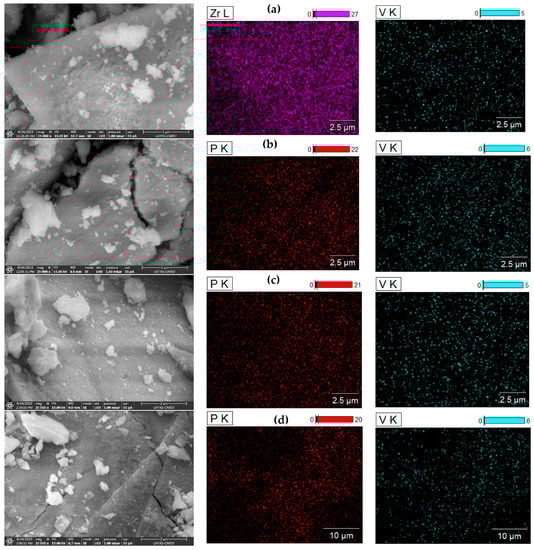 SEM and mapping images of the 3.6 wt%V2O5/ZrO2 loaded phosphate catalysts at different P/V ratio: (a) 3.6 wt%V2O5/ZrO2; (b) P/V = 0.5; (c) P/V = 1; and (d) P/V = 2.