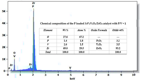 The surface and morphology of studied catalysts has been investigated by scanning electron microscopy (SEM) imaging and EDX analysis for the elemental mapping distribution. The photos from this technique are illustrated in Figure 7. It has been observed that the particle size is not uniform; however, the phosphorus and vanadium elements are well distributed. EDX has also been used to confirm the composition of the catalysts, in particular of the P loaded 3.6%V2O5/ZrO2 with P/V = 1 (Figure 8), which is the most active in oxidative dehydrogenation of propane.