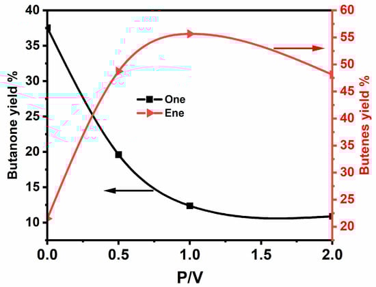 Catalytic activity of P modified V2O5 (3.6 wt%)/ZrO2 catalysts in air mixture depending on P/V ratio in butenes and butanone yield.