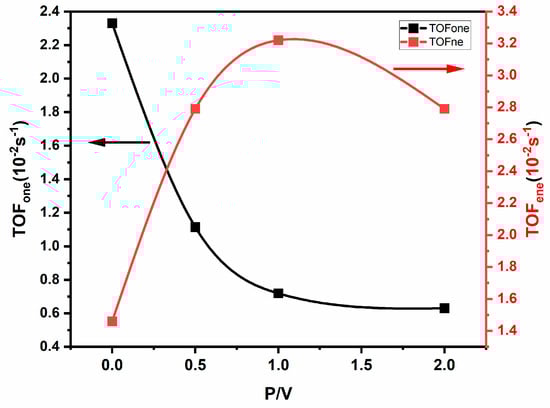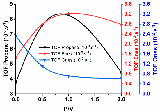 In order to compare the catalyst performances, the TOF was used to evaluate the impact of adding phosphate to 3.6 wt%V2O5/ZrO2. Figure 10 shows the TOF of both dehydration (TOFene) and dehydrogenation (TOFone) reactions depending on the P/V ratio as products of 2-butanol conversion. It has been observed that the TOF increases when the P/V ratio increases, attaining a maximum value for P/V = 1 then start to decrease. However, for the dehydrogenation activity, it decreases monotonically when the P/V ratio decreases, and it stabilizes at the value of P/V = 1 ratio, indicating a moderation of the oxidation sites of the alcohol.