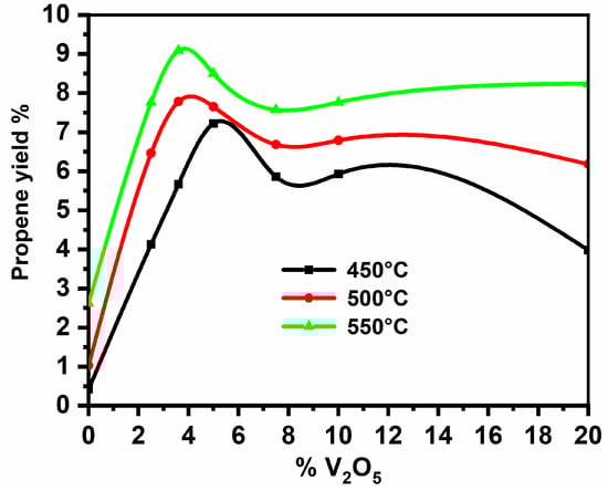 Evolution of the propene yield as a function of the V2O5 content and temperature for a reaction mixture air and propane.